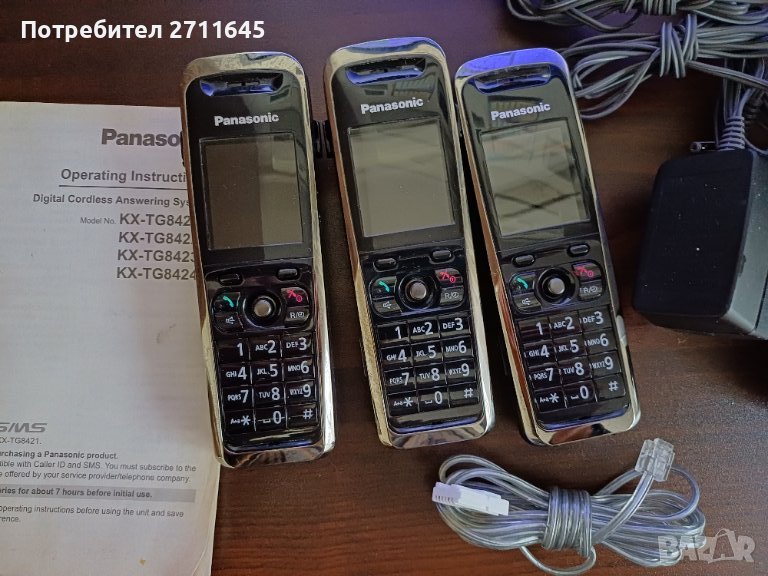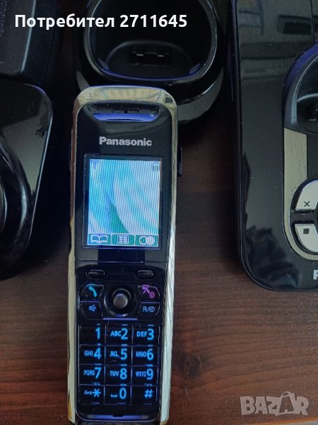Първокласно качество клас Panasonic DECT безжичен телефон, цветен дисплей, тел. секретар. Работи с батерии AAA. Секретар запис, 3 слушалки. Може да се добавят още допълнителни слушалки. Трите отделни слушалки могат да разговарят помежду си, прозвъняване към всяка отделна слушалка, записващ секретар, който може удобно да се изключва. Този модел е много висок клас, здрави рамки на слушалките, светещ цветен екран и клавиши. Трите слушалки могат да звънят едновременно при входящо обаждане, дълъг обхват с базовата станция, множество опции и настройки, запис на разговор, будилник и много други. Става и за офис с поставяне на слушалките в различни стаи, не е ползван много, купен в Англия, перфектен, издръжливи батерии, отделен спийкърфон към всяка слушалка, трансфер на входящ разговор към другите слушалки. Може да се ползва без телефонна линия само за вътрешни разговори. Упътване книжка, цифрови нотификации за наличие на запис на разговор. Налични презареждащи се батерии, отделни поставки за зареждане, ECO режим издържат до поне 10 дена с едно зареждане. Може да се добавят още допълнителни слушалки, като цената ще е друга с повече слушалки.