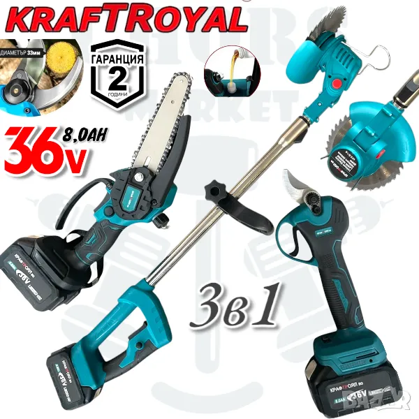 Акумулаторен Градински ПРОМО Комплект Акумулаторен Тример За Трева Храсторез и Акумулаторна Лозарска Ножица за Клони 36V 8,0AH KRAFTROYAL 33м + Подарък Резервен Нож и
