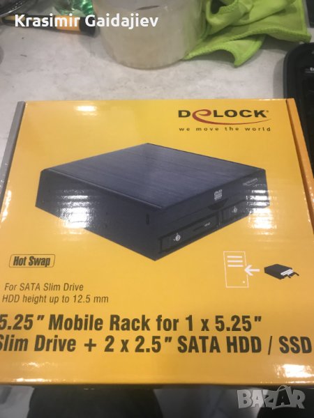 Тази мобилна стойка от Delock може да се инсталира в свободно гнездо 5,25 ″ на компютър. Към рамката могат да се монтират тънко устройство и два 2,5 ″ SATA твърди диска. Функцията за гореща смяна позволява смяна на твърдия диск по време на работа.