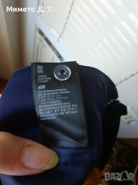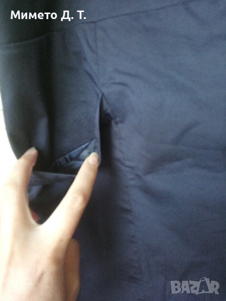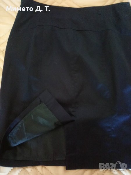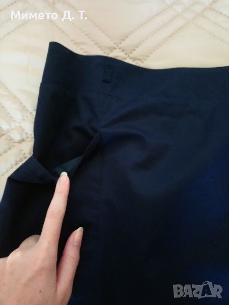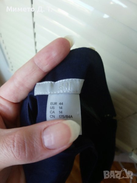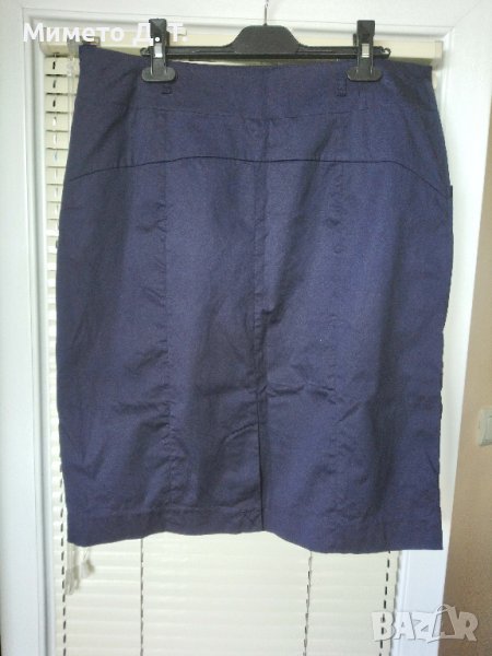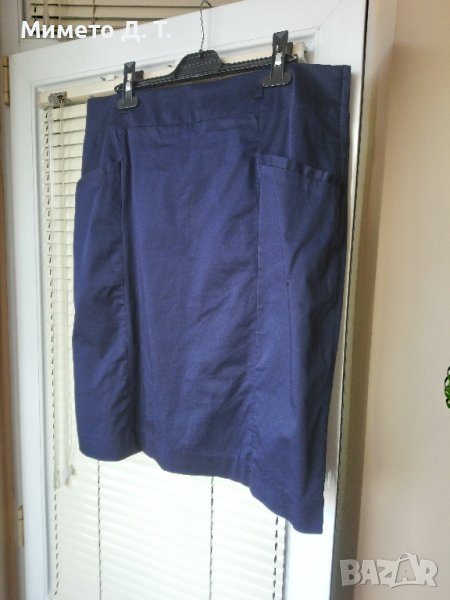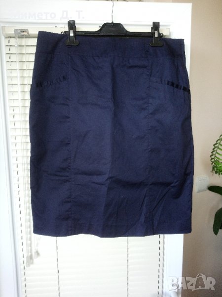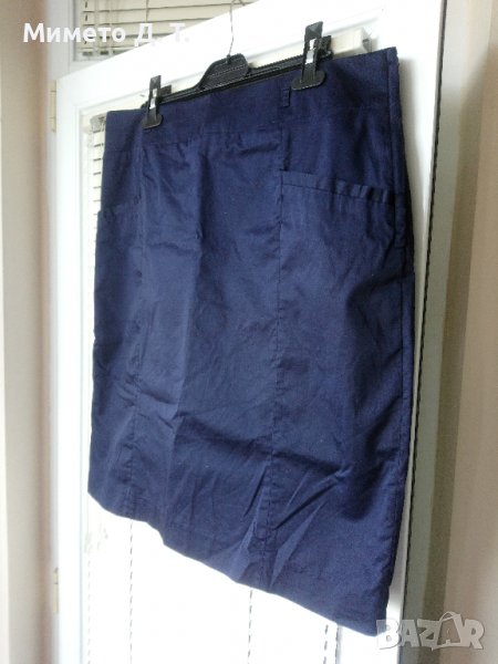 Без забележки, с джобове и цепка отзад. Материя 97% памук и 3 % еластан. Цвят - тъмно синьо. По етикет е размер EUR 44, US 14, CA 14