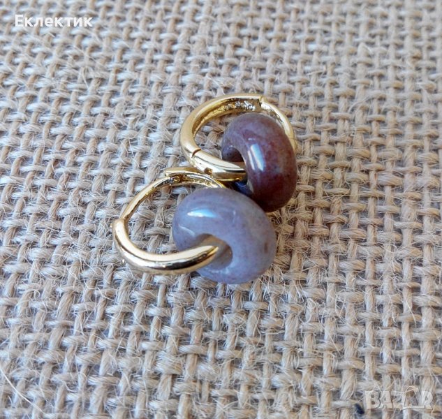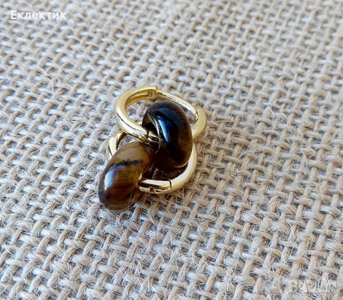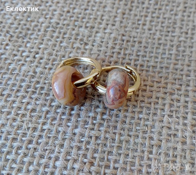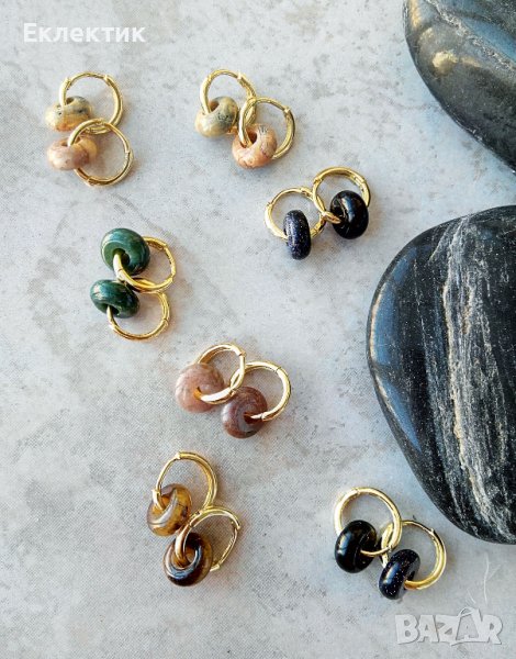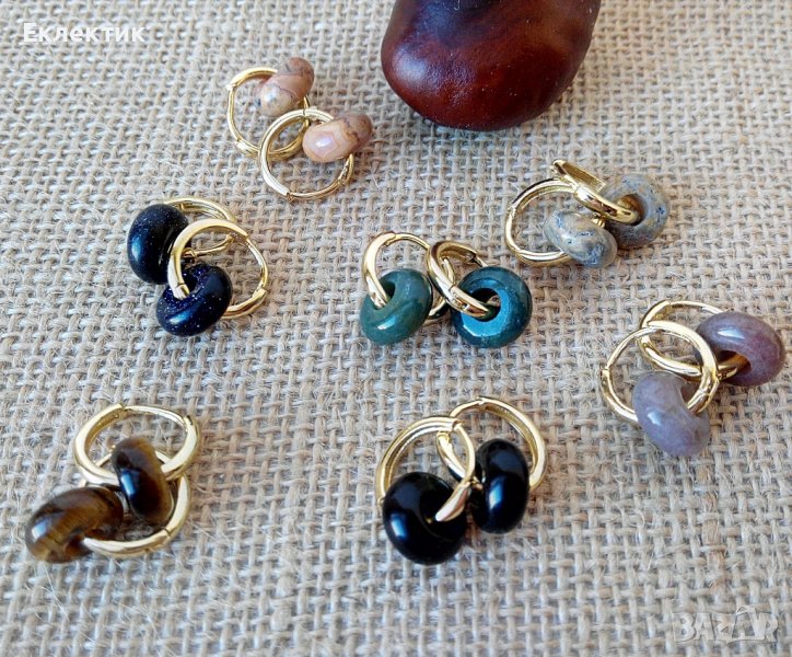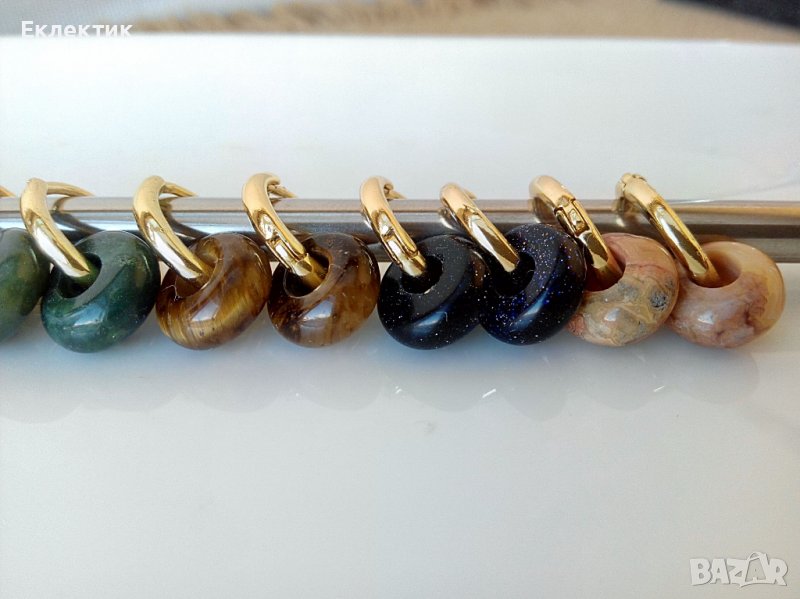 Мънистото е от полускъпоценни камъни: различни ахати, обсидиан, тигрово око, Goldstone. Размер – 10 х 5 мм.
