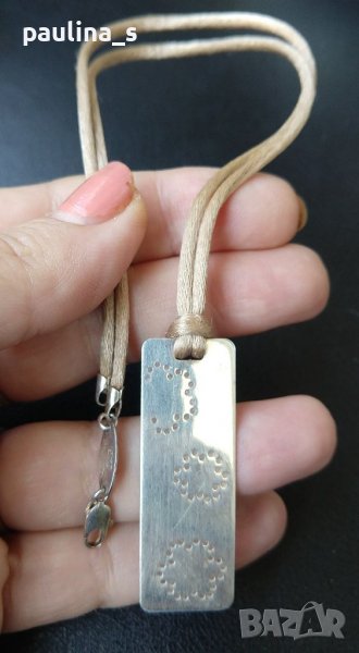 FURLA". Цената е крайна, без пазарлъци 72 евро. Марково сребърно колие тип чокър на копринена бижутерска връв, без дефекти, вижда се добре. Мащабирането е на дланта. Не се продава на грамаж, цените на артикулите от марката са известни!