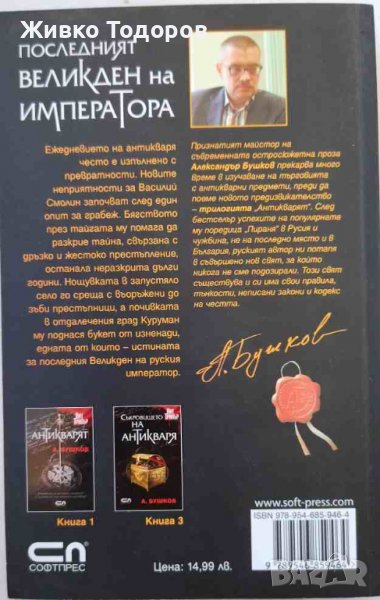 Ежедневието на антикваря често е изпълнено с превратности. Нoвите неприятности за Василий Смолин започват след един опит за грабеж. Бягството през тайгата му помага да разкрие тайна, свързана с дръзко и жестоко престъпление, останала неразкрита дълги години. Нощувката в запустяло село го среща с въоръжени до зъби престъпници, а почивката в отдалечения град Куруман му поднася букет от изненади, едната от които - истината за последния Великден на руския император. Признатият майстор на съвременната остросюжетна проза Александър Бушков прекарва много време в изучаване на търговията с антикварни предмети, преди да поеме новото предизвикателство - серията "Антикварят". След бестселър успехите на популярната му поредица "Пираня" в Русия и чужбина, не на последно място и в България, руският автор ни потапя в съвършено нов свят, за който никога не сме подозирали. Този свят съществува и си има свои правила, тънкости, неписани закони и кодекс на честта.