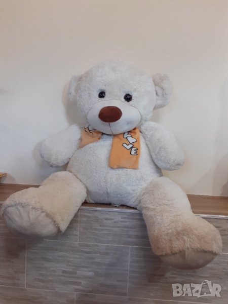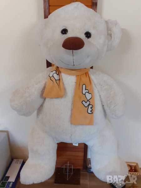 Продавам голяма бяла плюшена мечка със жълт шал със надпис - LOVE