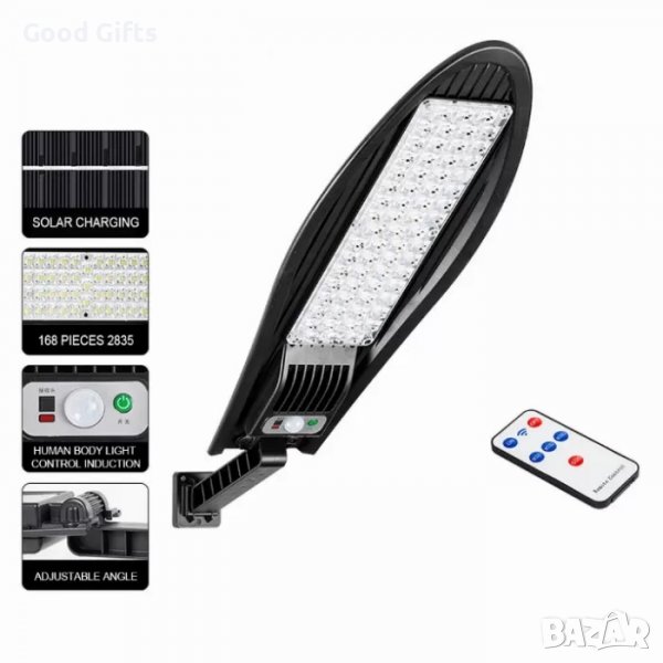 LED соларна лампа 375 W със сензор за движение. През деня събира слънчева енергия и я съхранява в литиева батерия. През нощта се включва автоматично, осигурявайки силна светлина при наличието на движение. Когато няма хора около лампата, тя автоматично се изключва след около 20-30 секунди, като по този начин пести енергия.
