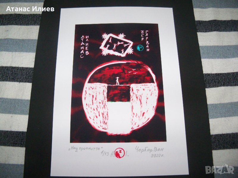 Картина "Над пропастта" на художника ЧерГарВан псевдоним на Атанас Илиев. Картината е тиражно изкуство, рисувана с туш, сканирана и обработена на компютър, след което е отпечатана на специална хартия 170гр. формат А4 в 13 екземпляра. Картината е първи отпечатък от 13. Картината е подписана и датирана от автора и подпечатана с личния му печат.