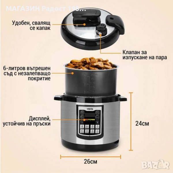 - 12 програми: пържене, фасул, торта, бавно готвене, месо, стопляне, ориз, супа, пара