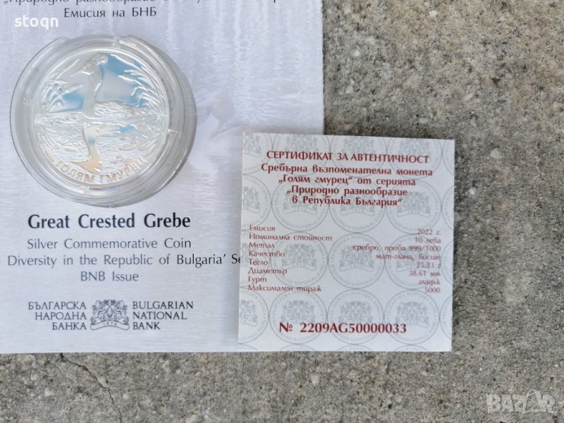 Сребърна монета 10 лева 2022 година Голям Гмурец → Обява 38096802
