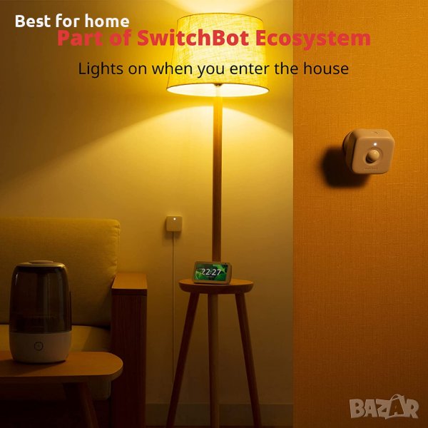 Сензорът за движение и ботът работят заедно като вашия Switch Manager. Свързан с Hub Mini, когато влезете в спалнята, с две заети ръце, SwitchBot Bot ще ви помогне автоматично да включите/изключите светлината.