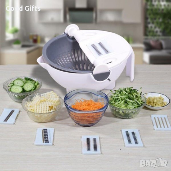 Мултифункционална купа с ренде и цедка Magic Vegetable Cutter 8 в 1 може да се използва за плодове и зеленчуци. Тя реже като истински професионалист и с нея рязането ще бъде песен. Освен всичко това, тя е с цедка. Миете и режете салата в един уред. Можете да режете във всякаква форма, а благодарение на защитната шапка избягвате порязвания. Подходяща е и за миене в съдомиялна. В комплекта ще намерите и приставки.