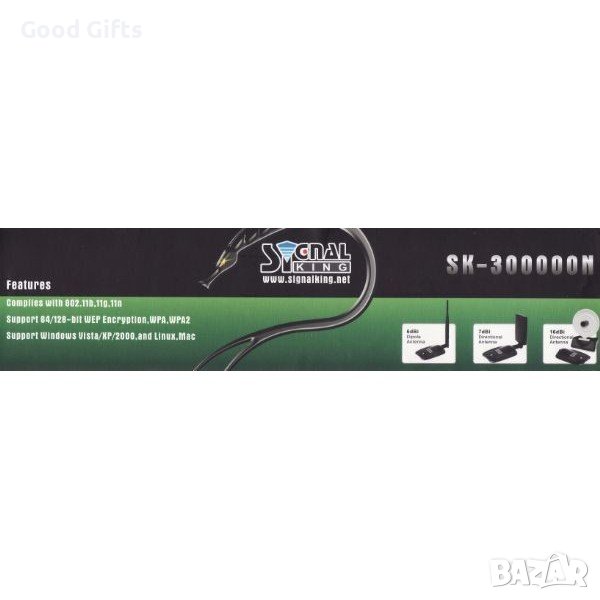 Едно много полезно устройство за WIRELESS връзки WIFI рутер - SIGNAL KING 300000N, 68dBi, 2500mW т.н. крадец на интернет. Хардуер плюс софтуер за хакери. Хардуерно представлява активна антенна с голям коефициент на усилване 68 dBi с електронно устройство рутер подключващо се към USB порт. Антената е мощна насочена радарен тип. Увеличава многократно диапазона на WIRELESS връзките. Спомага да видите много повече безжични мрежи около вас, да увеличите силата на сигнала на досега вижданите и ви съдейства посредством софтуер да се свържете със заключени мрежи. Придружена е с необходимия софтуер за целта. Подържа Beini и др. програми. Работи с ОС Windows 2000, XP, VISTA, MAC, LINUX. За да сте сигурни, че сте наясно за какво става дума, моля запознайте се с описанието от производителя на устройството от снимките на опаковката. Моля да купуват само лица, които са сигурни, че ще се справят с инсталирането на необходимия софтуер и настройка на системата! Състояние чисто ново, опаковка от производителя. В комплекта: кутия с WIFI рутер -SIGNAL KING 300000N, насочена антена 68 dbi, ръководство на потребителя на хартиен носител на английски и китайски език, два диска със софтуер, USB кабел.