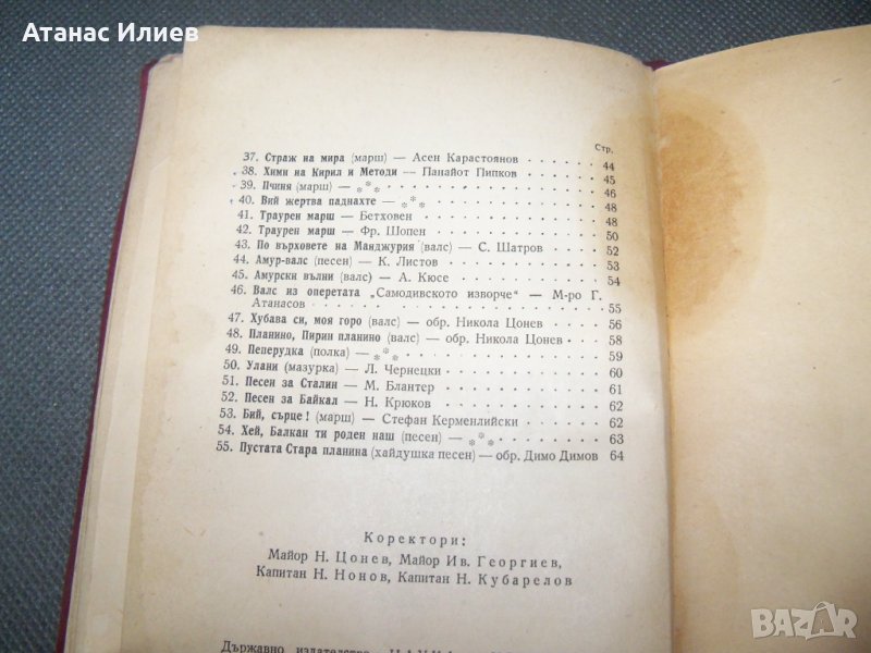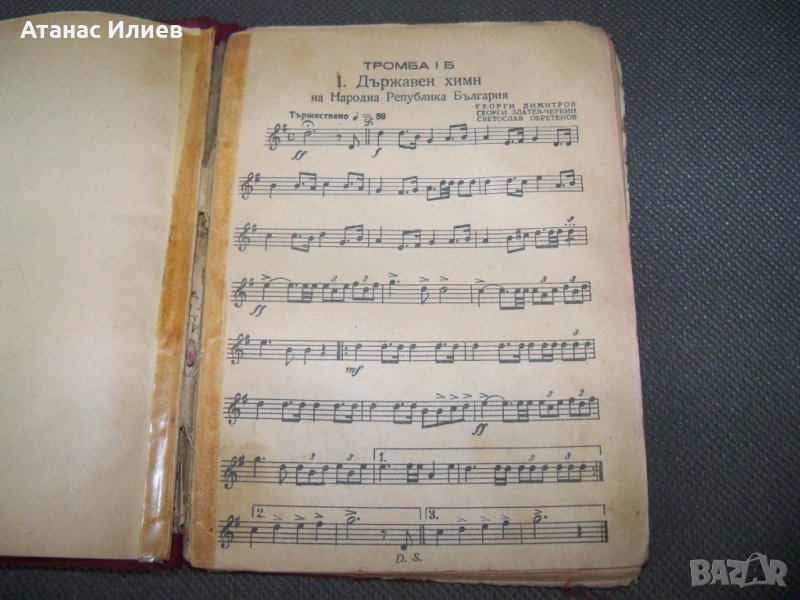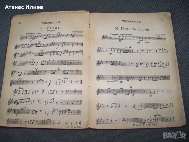 "Служебно строеви репертуар на духовите оркестри на народната войска - тромба 1 Б". Книжката е издадена през 1951г. от Министерство на народната отбрана. Подвързана е с твърди корици, 64 стр. няма липсващи страници.