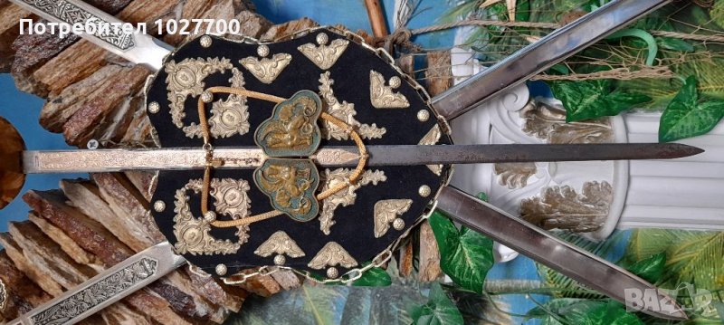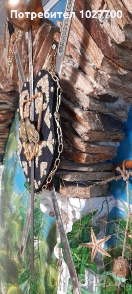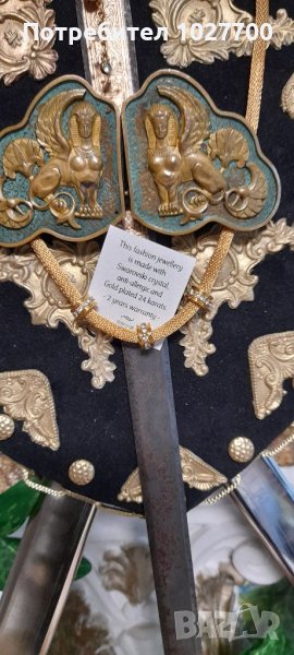 Плакета е от изложение на стари оръжия и бижута . Оръжията са състарени, шпагата е закалена може да се пробие броня с нея . Токите с грифони в средата са афтентични, огърлицата е изработка тип змия средновековен модел, покритие 24 каратово злато, халките са с кристали саваровски , дължина 50 сантиметра !!! Плакета е единствен , единична бройка !!! Масивен е , 90/90см !!!