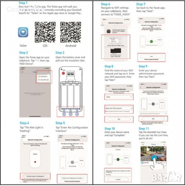 Видео звънецът разполага с три акумулаторни батерии със спецификация 18650. Те се зареждат с USB кабел, който може да включите в контакта