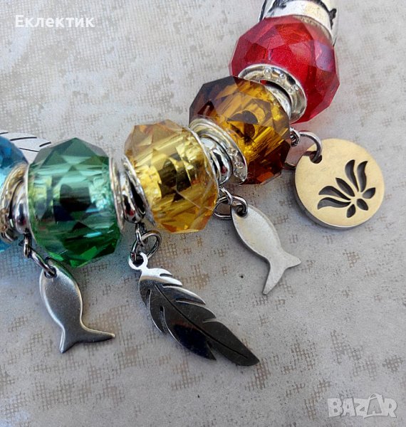 избрани в унисон с будисткия/йога тон на гривната – пера, риби, лотос,