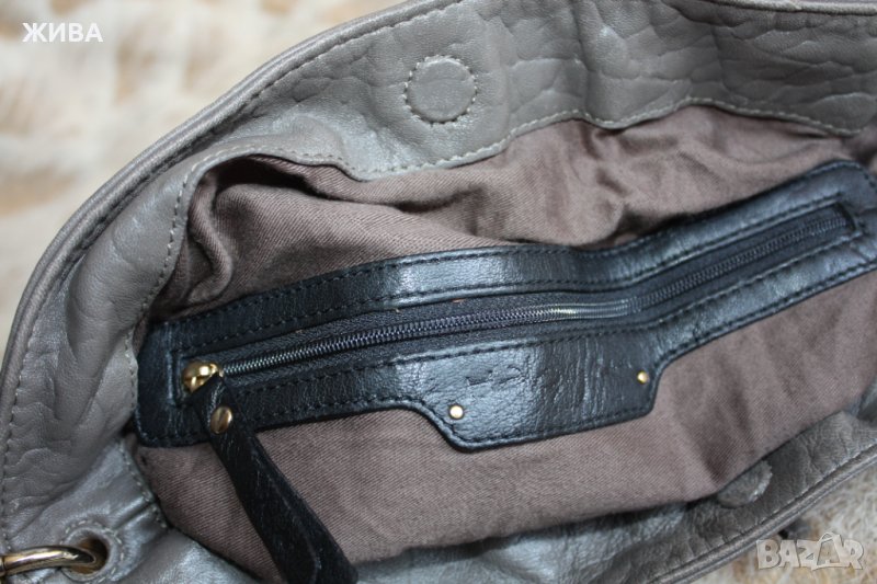ЕСТЕСТВЕНА КОЖА дамска чанта в два цвята, с три вътрешни джоба, от които единия с цип, с една дръжка. Височина на чантата 35см., ширина 38см., дъно 12см., дръжка 50см., може да се носи и на рамо-
