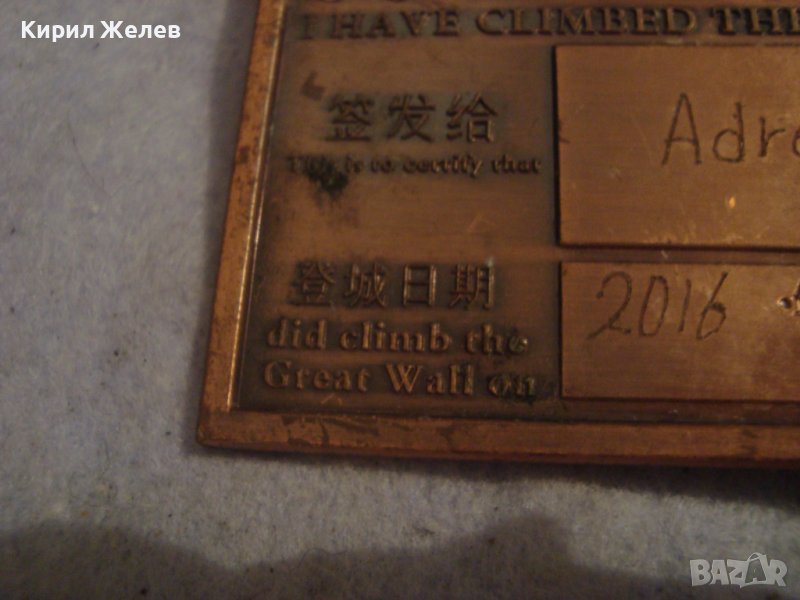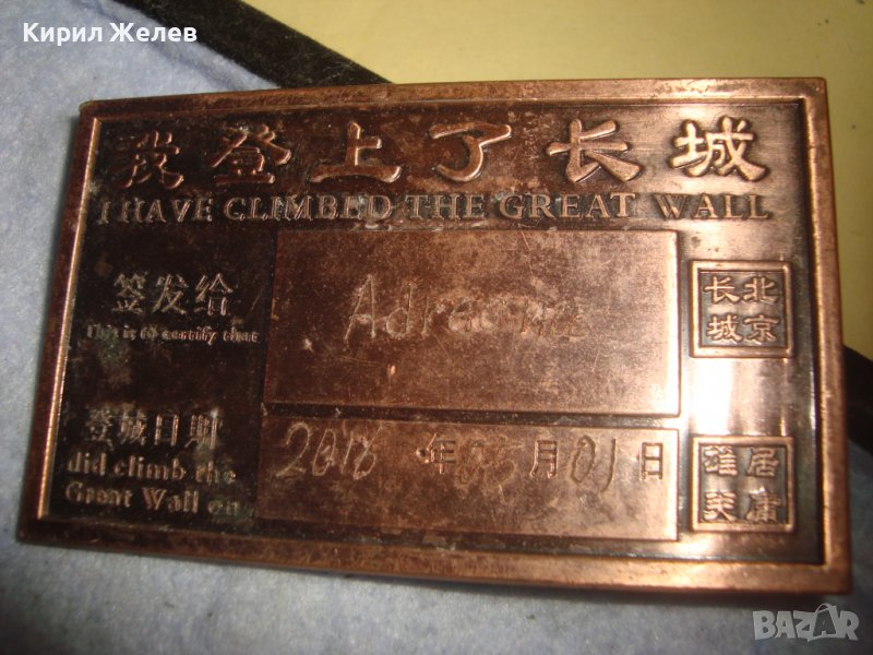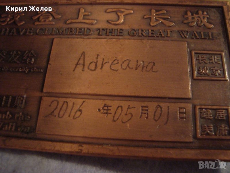 ПАМЕТНА МЕДНА ПЛОЧКА ПЛАКЕТ за ПОСЕЩЕНИЕ на ВЕЛИКАТА КИТАЙСКА СТЕНА 2016г. СУВЕНИР от КИТАЙ 27218 → Обява 38129336