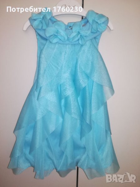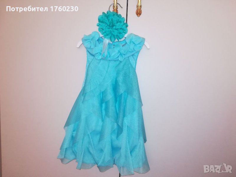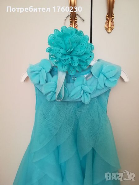 Продавам бебешка рокличка в тюркоазено. Размер 18-24 месеца. Може да се закопчава като боди отдолу или може да остане отворена. Материята е памук и тюл. Изключително мекичка. С махнат етикет. Към рокличката има и лента за глава - огромно цвете.