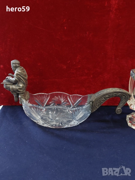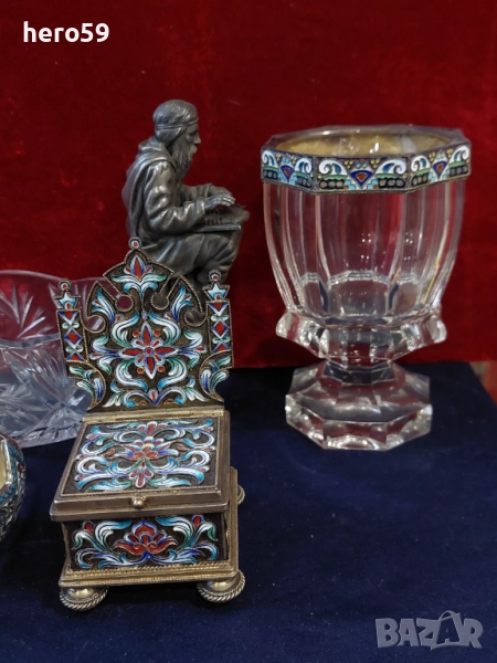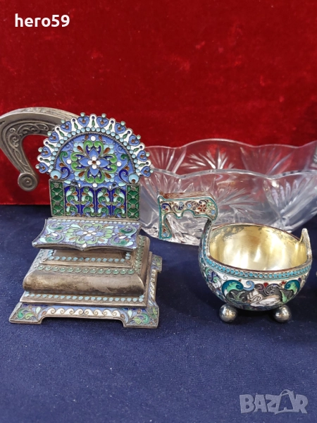 'Поради новата политика на базар бг. се налага да правя лотове на обявите ми.Всеки който иска повече информация за даден артикул ще му бъде предоставена на вайбър след като се свърже с мен.Благодаря Ви предварително за разбирането!'Царска русия-сребърни артикули,голяма кристална купа(ковш) със сребърна фигура-6000 евро.Две сребърни солонки с клетъчен емайл,едната с цена 2500 евро,другара 5500 евро,кристална чаша с клетъчен емайл и сребро 88,цена 2500 евро,малък чирпак(ковш) сребро 84 с клетъчен емайл цена 3200 евро.УВАЖАЕМИ ГОСПОЖИЦИ,ГОСПОЖИ,И ГОСПОДА,ПОРАДИ НОВАТА ПОЛИТИКА НА САЙТА СЕ НАЛОЖИ ДА ПРЕМАХНА НЯКОЛКО СТОТИН ОБЯВИ,А И МНОГО, САМИЯТ САЙТ МИ ИЗТРИ,ПОРАДИ ТАЗИ ПРИЧИНА СЕ НАЛАГА ДА ПРАВЯ ЛОТОВЕ НА ДАДЕН ВИД АРТИКУЛИ ИЛИ ДА ГИ ПРЕМЕСТВАМ В ДРУГИ МОИ ПРОФИЛИ В БАЗАР.НА ВСИЧКИ МОИ ПРОФИЛИ СТОИ ЕДНА И СЪЩА СНИМКА НА КУЧЕТО МИ.
