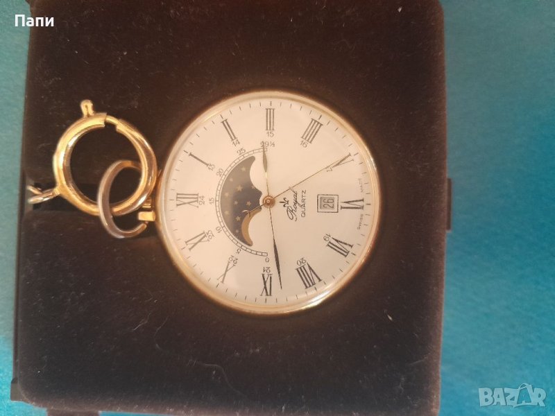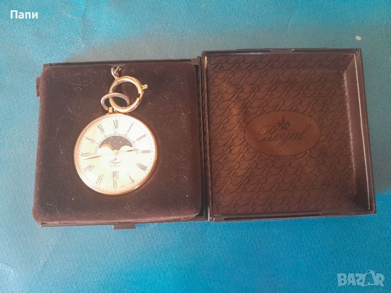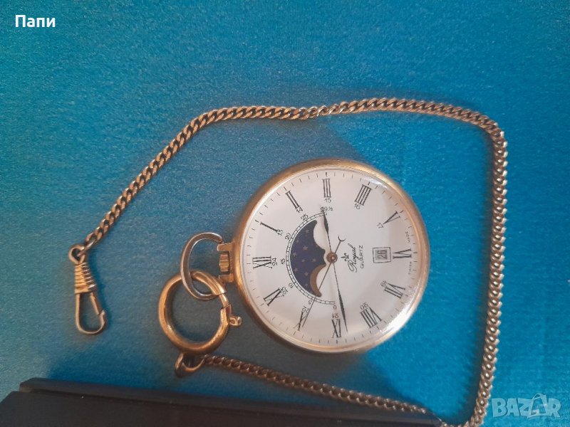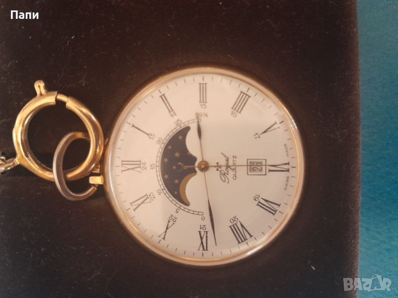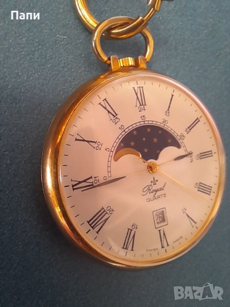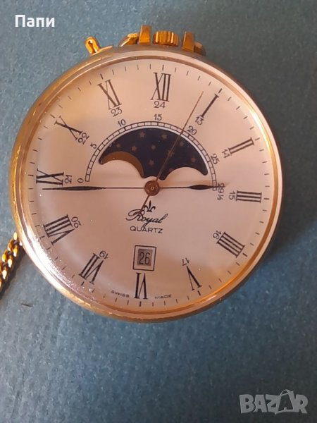 Швейцарски Royal Swiss,модел Open Face с дата и фаза на луната. Материал на корпуса 10 мимрона,18 к. позлатен. Диаметър 42 мм. Часовника е от 80-те год. Много точен,цепи секундата.
