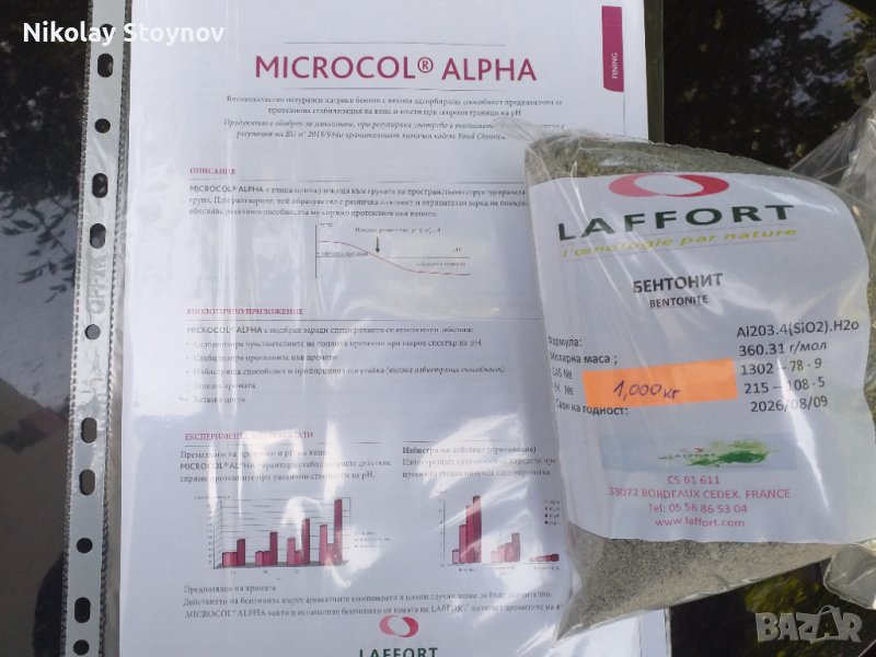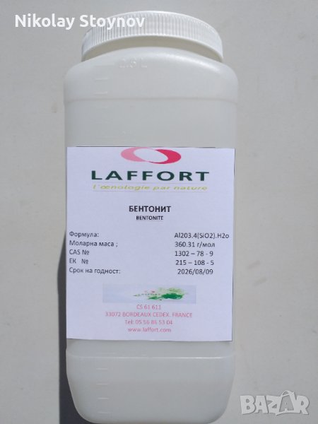 Имам удоволствието да Ви предложа 100% натурален микрогранулиран БЕНТОНИТ на френската фирма LAFFORT ! Това е семейна компания от четвърто поколение, основана през 1895 г. в сърцето на лозята на Бордо, Франция. Вече повече от 120 години LAFFORT® е решително фокусирана върху създаването на техники за производство на вино на бъдещето. Компанията развива прецизна, модерна, устойчива и произхождаща от природата енология. С повече от 100 служители в авангардна производствена база в Бордо, LAFFORT® притежава високо технологична лаборатория, в която се извършват енологични експертизи в глобален обхват, съобразявайки се и адаптирайки се към специфичния характер на всеки пазар. Компанията разработва, произвежда и разпространява енологични решения , чрез дъщерните си дружества в повече от 60 страни.