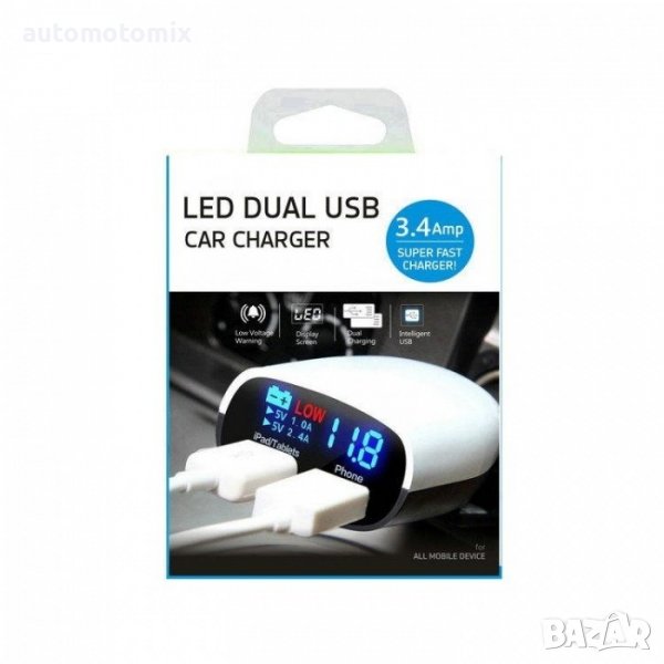 Модел: 182100 - 1667 Зарядно за автомобил с два USB порта и дисплей Входно напрежение: 12/24V Изходен ток: DC 5V / 3.4A
