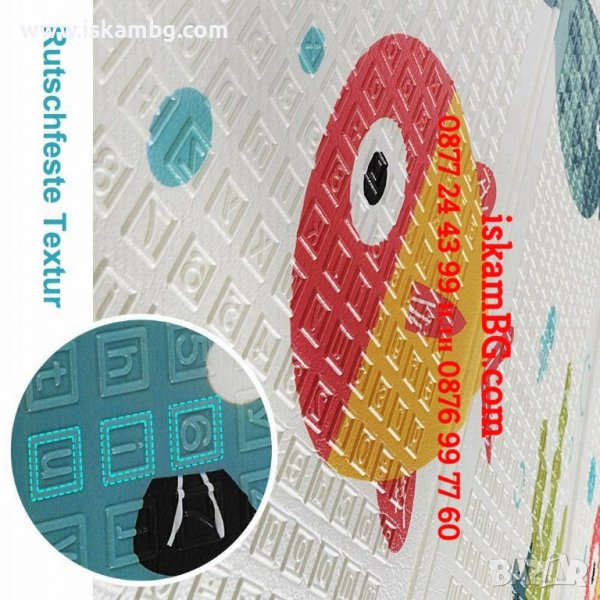Релефната повърхност предпазва от подхлъзване и в същото време стимулира фината моторика на децата. Цветните принтове стимулират зрението и въображението.