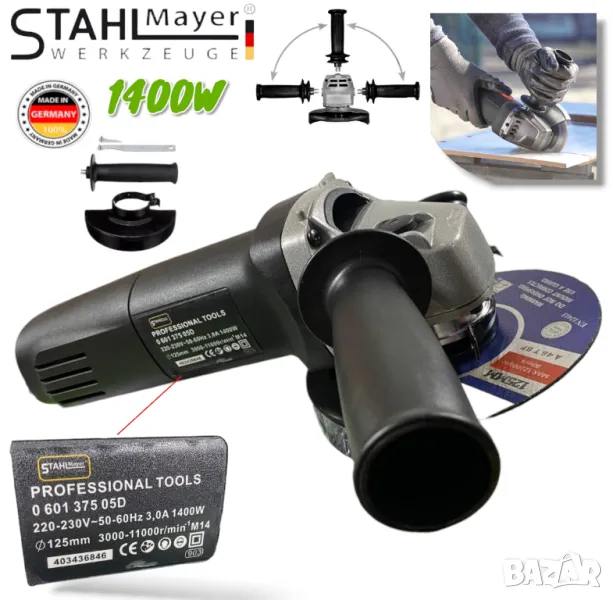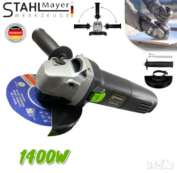 Немски комплект Ъглошлайф 1400W 125mm + Перфоратор 1600W STAHLMAYER с шило,секач и 3бр бургии в удобен пластмасов куфар, на страхотна цена от 129лв