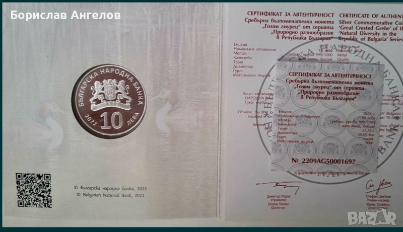 Сребърна монета-Голям гмурец. В капсула и със сертификат!!! Сребърна възпоменателна монета от серията “Природно разнообразие в република България”