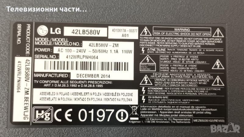LG 42LB580V със счупен екран-EAX65423701(2.1)/EAX65610905(1.0)/6870C-0480A/LC420DUE(FG)(A4)