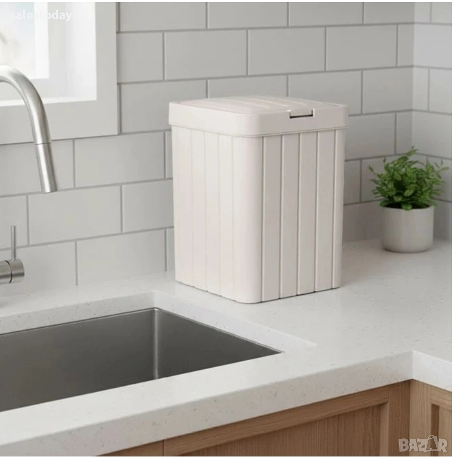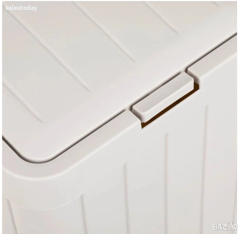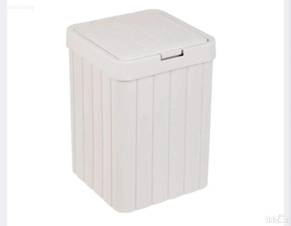 Правоъгълен пластмасов кош за отпадъци в бежов цвят, с вертикални релефни линии и капак, който се отваря лесно с бутон.
