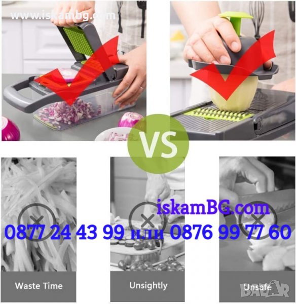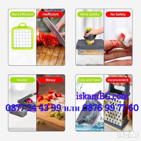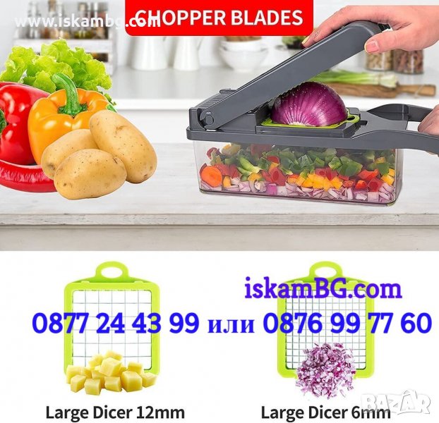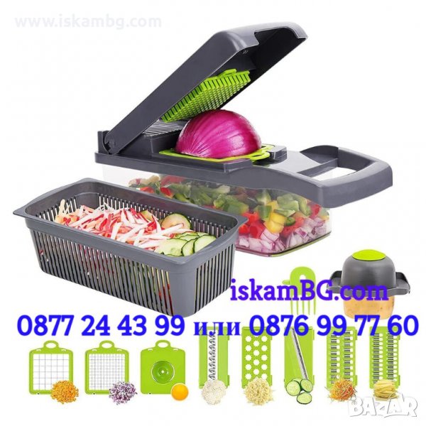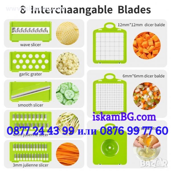Кухненският комплект е многофункционален и наистина ще ви спести време при приготвянето на разнообразна храна. Изработен от нетоксична, подходяща за храни пластмаса със здрави, метални приставки. С него лесно ще нарязвате на кубчета, ще настъргвате за секунди, ще кълцате и много др. без усилие. Разнообразието от приставки ви дава свобода и удобство при употреба. Модела има и включен в комплекта ефективен протектор за ръцете, за да избегнете нараняването на пръстите ви дори при рязане на храната на 1мм. Уникалният дизайн на дръжката срещу хлъзгане прави рязането по-лесно. В същото време дъното на чопъра за салати е проектирано с неплъзгащи се силиконови крачета, които могат значително да повишат стабилността.