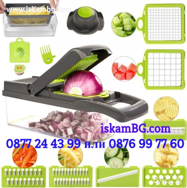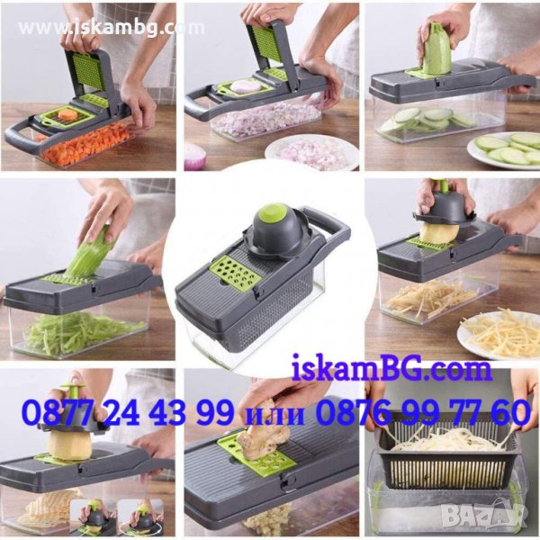Многофункционалната ренде за зеленчуци със 7 взаимозаменяеми аксесоара може да се използва и за съхранение на храна в хладилника, благодарение на капака с херметично затваряне.