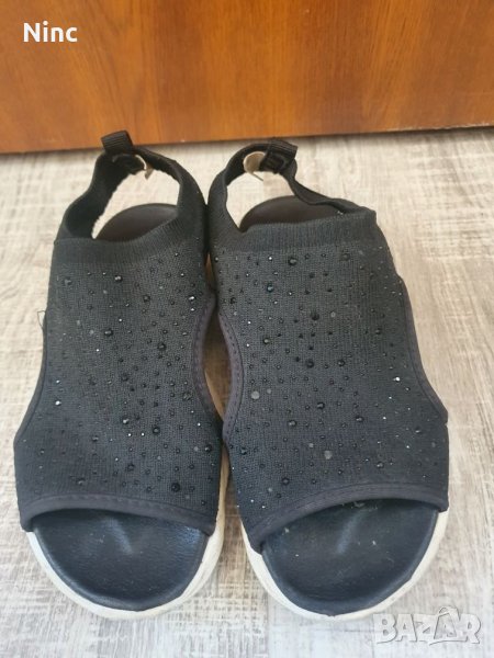 Сандалите са ориг.Стелката е 22см.от пръста до петата.Нямат забележки.Плата е леко еластичен.Цвета е черен сблестяши черни камъчета.