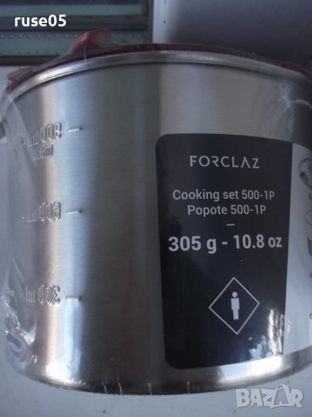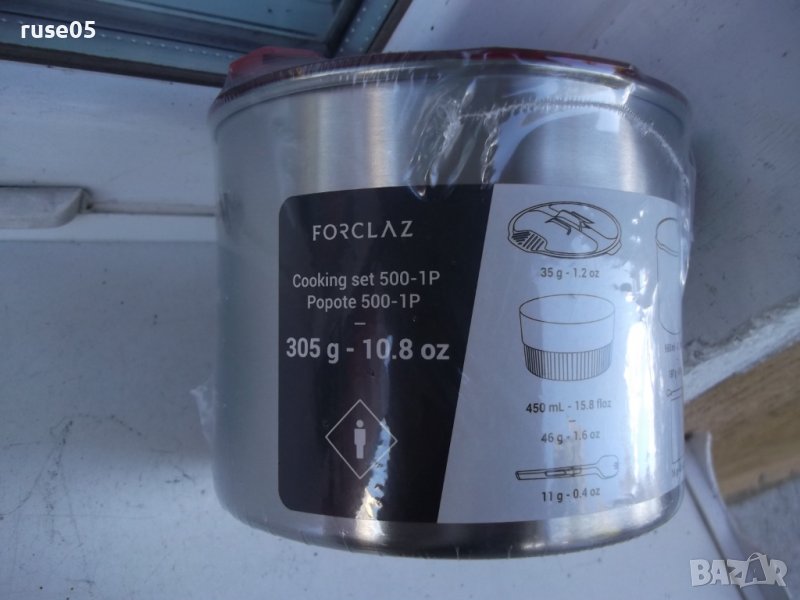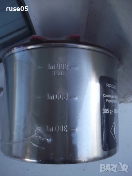 Градуирана тенджера с патентована сгъваема дръжка (използваеми 950 мл, 197 г, Ø 13,5 x 11 см); 1 купа с релеф за топлоизолация ( използваеми 0,45 л, 13 x 6,5 см, 46 г); 1 сгъваем прибор вилица/лъжица (11 г, дължина 18,5 см); 1 капак / цедка (35 г); 1 калъф (16 г)
