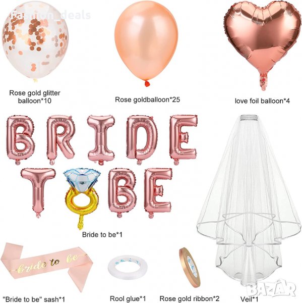 25 балона от латекс, 10 пълни с конфети, 4 балона от фолио сърце, воал, лента и надпис от балони bride To Be