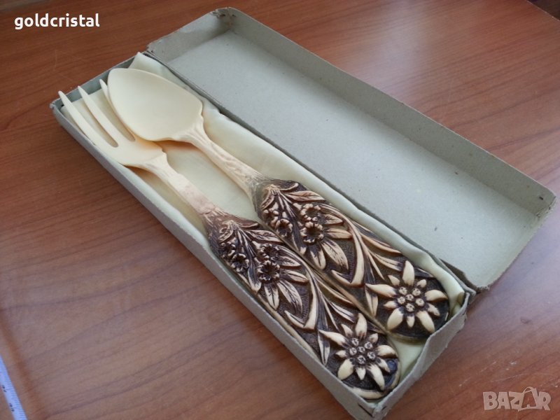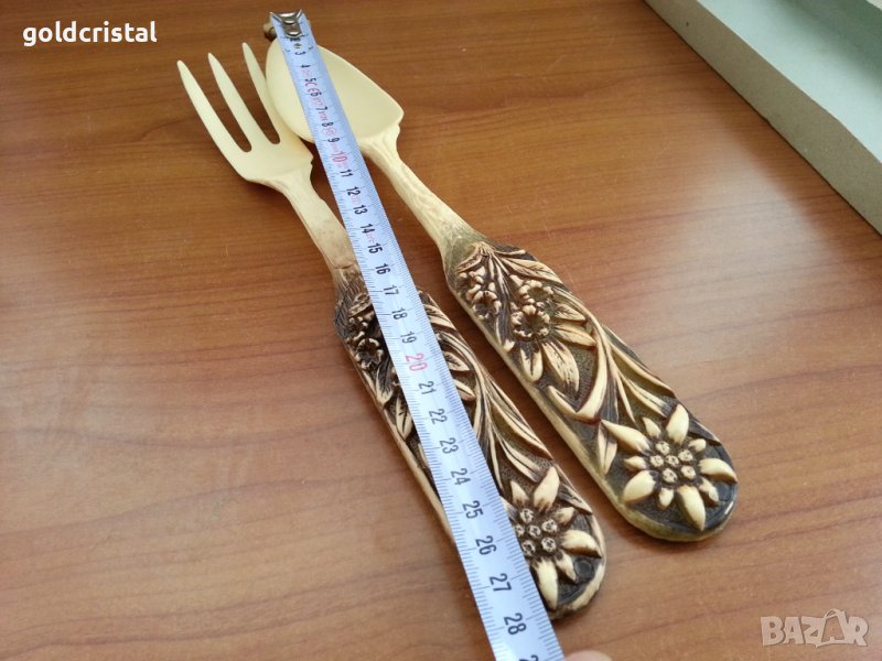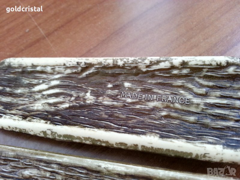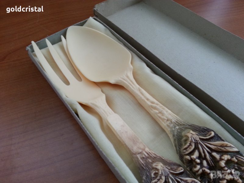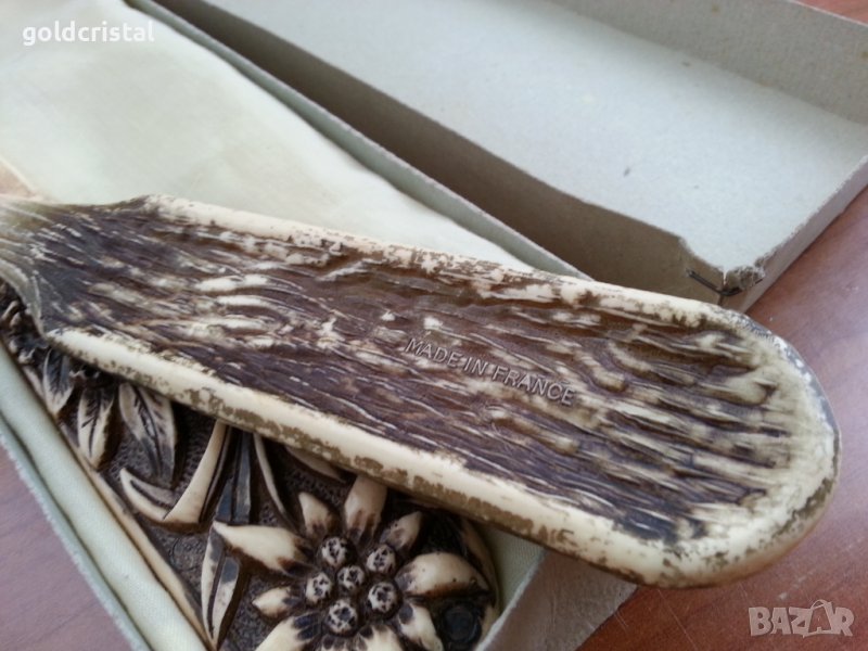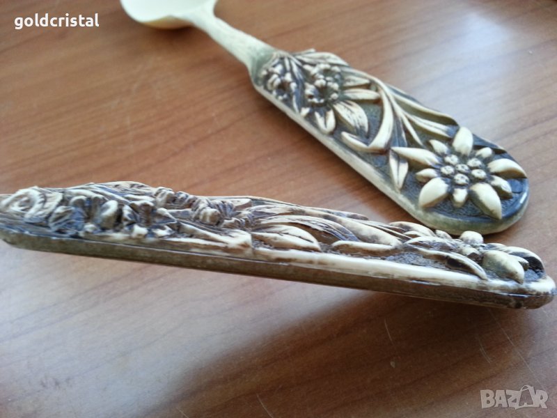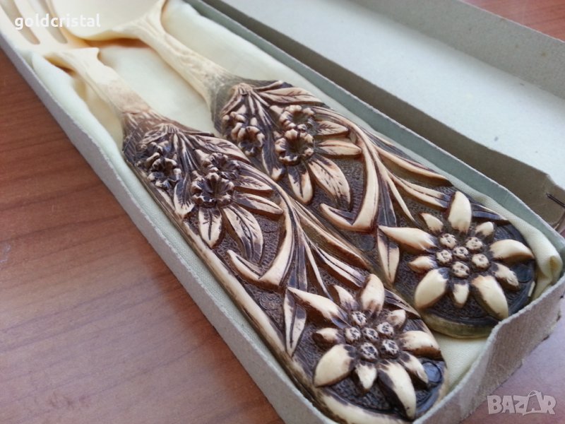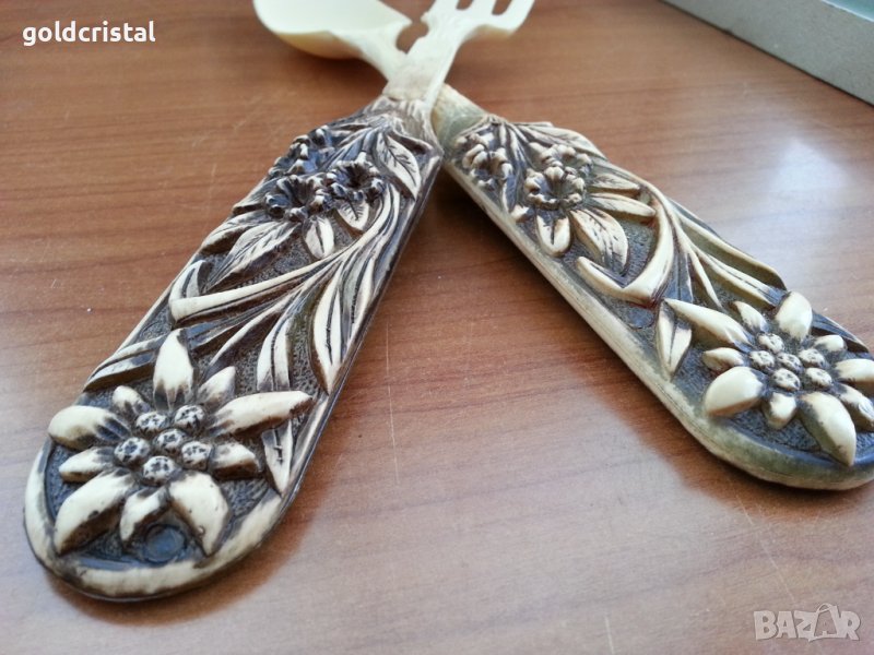 Френски прибори за сервиране нови в кутия гравирани еделвайси маркирани Франция материал прилича подобно на пластмаса сервиз комплект сет лот ретро арт декор винтидж колекция стари антикварни предмети обзавеждане за дома и семейството подходящи за подарък за ценители и колекционери