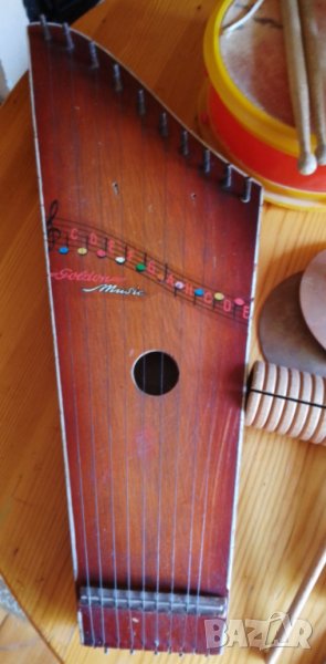 1. Детска немска цитра Goldon Music, произведена в ГДР. Дължина при струната на ДО - 47 см, дължина при горно ДО - 31 см. Най-широката част е 18 см, а най-ниската - 8 см. Струната на горно до липсва. Цена 55 лв;