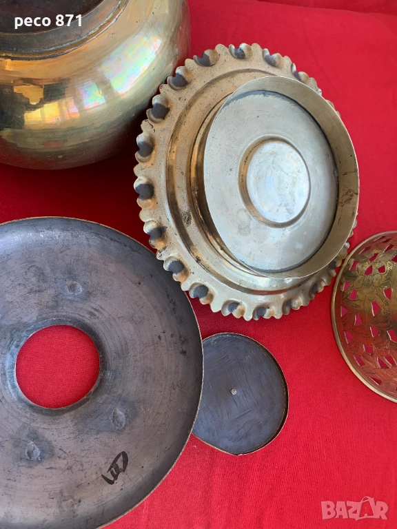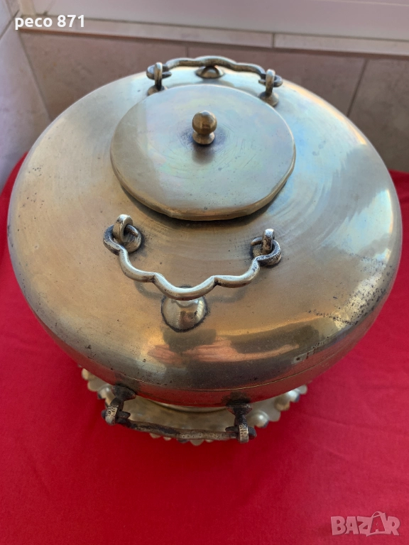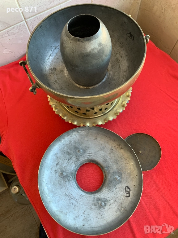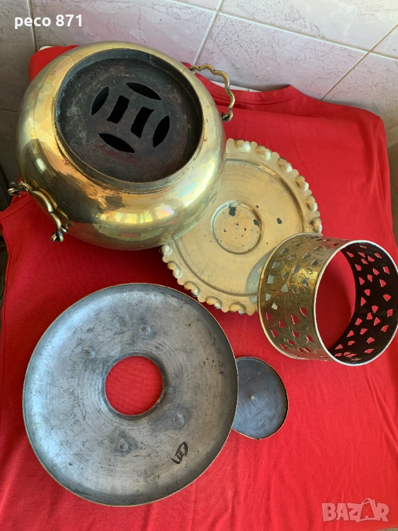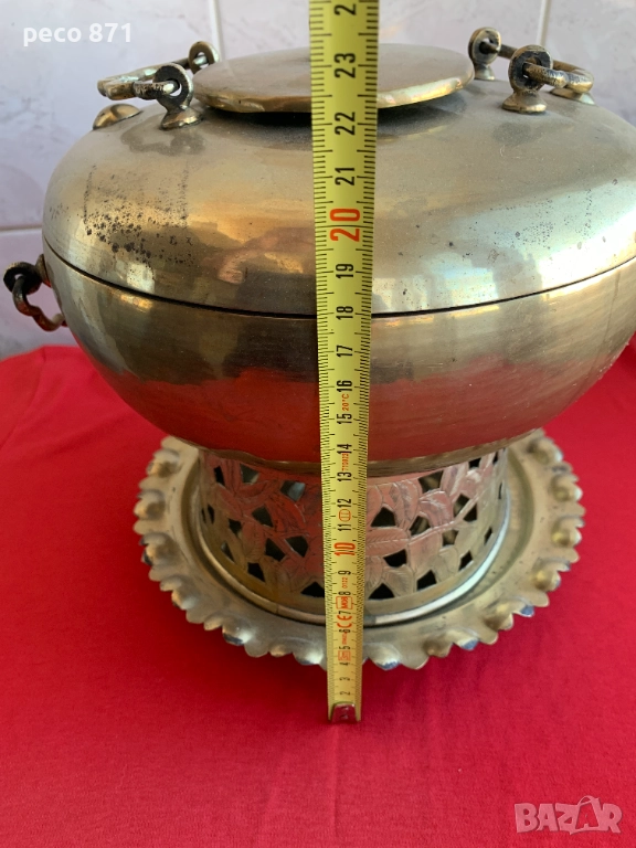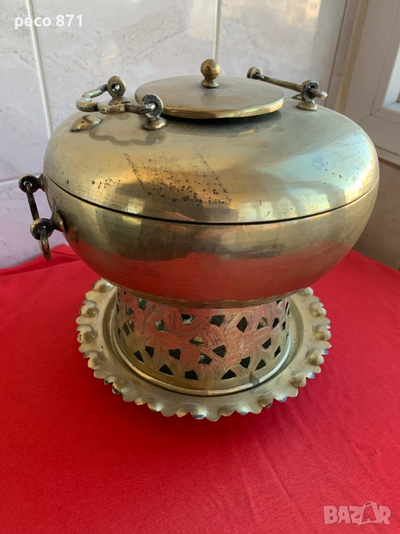Състояние,по снимките,закъсвания.Ако имате въпроси,пишете на лични.За София лична среща в района на Бъкстон или Руски паметник.Не работя със Спиди."Принципът на фондюто - ястието да се приготвя на масата (а не предварително в кухнята) е характерен не само за швейцарската национална кухня. Той се прилага от столетия в китайската кухня, където например в съд, наподобяващ самовар, на масата се сервира горещ бульон, към който се добавят по избор раци, бамбукови кълнове, спанак, рибно филе, подправки и т.н. и го доваряват на жар от въглища".Изделието е изцяло месингово,височина,около 23,5см.,ширина/по средата,в най-широката част/21,5см.Много наподобява самовар,в средата/в конуса/се слагат дървени въглища,а отстрани се сипва вода,вътрешната част седи като калайдисана.Разглобява се,има скара от където да пада пепелта и влиза въздух,долната част,която е между таблата и горната част,не е само за украса,дупките са за да влиза въздух и горната част да не е залепена за таблата.Най-вероятно е използван за фондю,предполагам в Китай,по-малко вероятно,в Монголия,Корея или Япония.