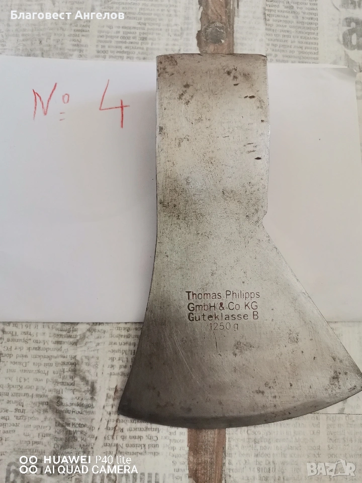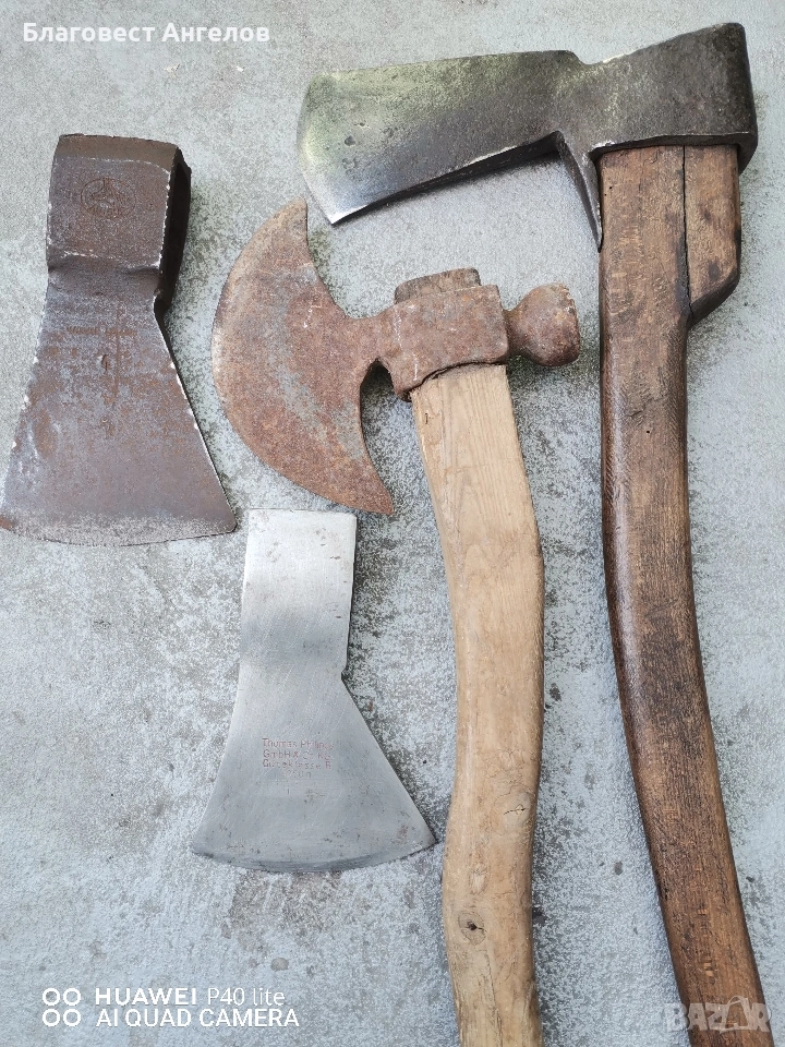 Стари топори, номер 1 е с приблизително тегло 2,500 кг. цена 200 евро, номер 2 е с приблизително тегло 1,450 цена 180 евро, номер 3 е с тегло 1,450 кг. цена 80 евро, номер 4 е неизползван с тегло 1,170 кг. цена 70 евро.