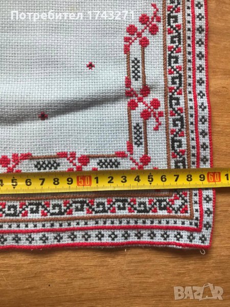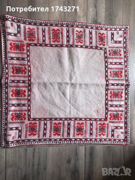 1. Каре бродирано на ленена панама с размери 57 см., 54 см., без скъсано и наядено от молци. При изпирането му червените конци пуснаха и оцветиха на места панамата. Цена 15 лв..