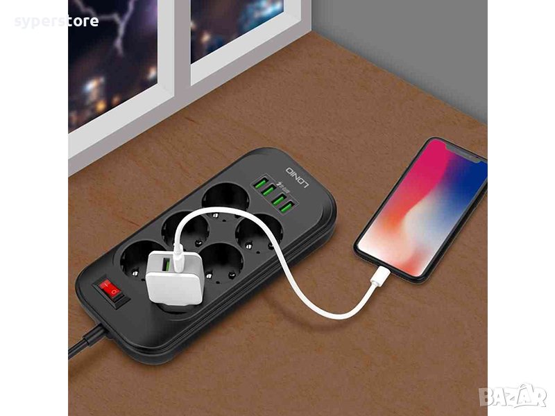 Разклонител LDNIO модел SE6403, 10A, 2500W. Разклонителят има 6 гнезда, 4 USB порта, копче за включване и изключване. Дължината на кабела е 2м. USB портовете са с технология за интелигентно зареждане - всеки USB порт разпознава автоматично включеното устройство ( GSM, Таблет, Power Bank и др.) и автоматично подава от 0.1 до 3.4А.