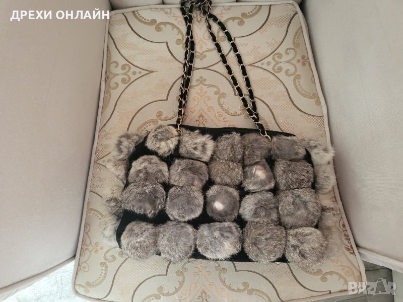 Дамска чанта с естествен косъм, цвят сива, използвана, има леки забележки които се виждат на снимките, на 2-3 топки.
