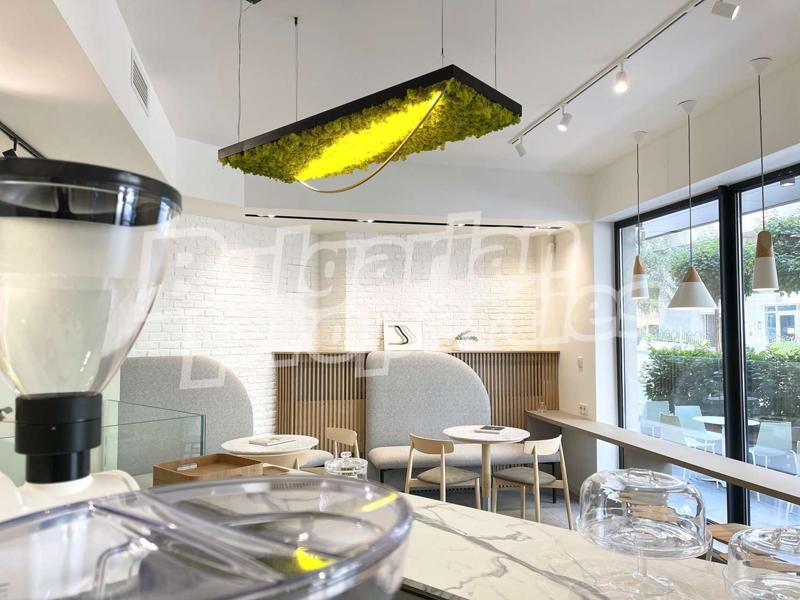 - Осветителните тела на италианската марка OLEV като шумоизолиращата лампа с истински мъх, стълбищният парапет със скрито осветление и модерните лунички вградени в стената по продължението на стълбището са някои от интересните и модерни видове осветление използвани в интериорния дизайн на заведението, които успяват да го отличат.