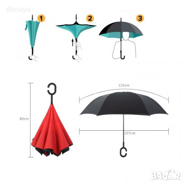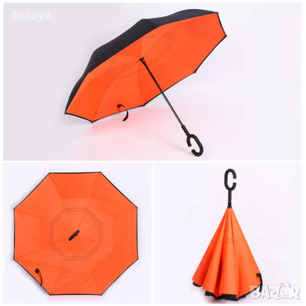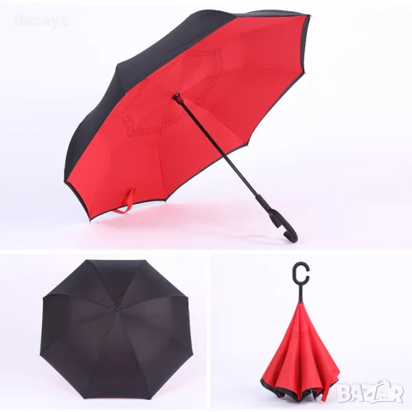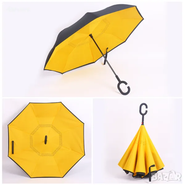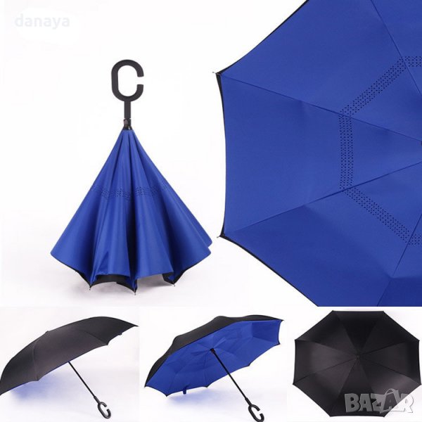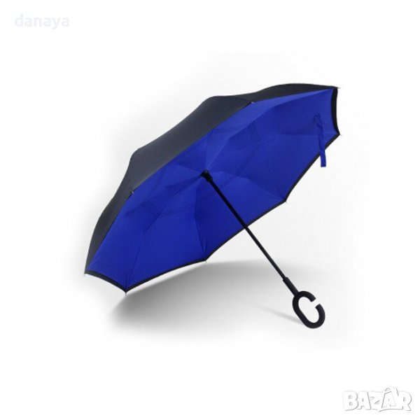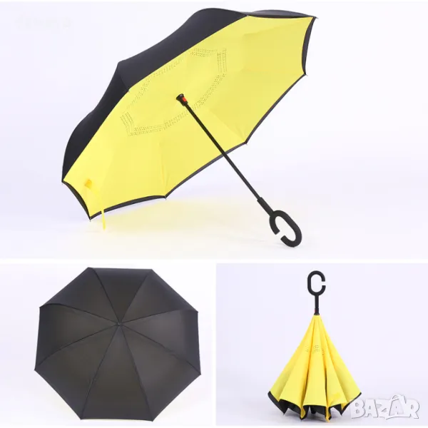 чадър, двупластов. Затварящ се наобратно чадър и отварящ се наобратно. Двупластов чадър сгъващ се наобратно. Ветроустойчив чадър за дъжд. Здрав и стабилен, устойчив на силен вятър. Повърхност от полиестер, метални спици и дръжка от каучук, която позволява функцията свободни ръце. Изработен от два слоя плат, с UV защита от слънце. Чадърът е с ръчно отваряне и затваряне.