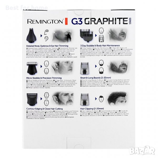 Graphite G3 ще се погрижи за вашата рутинна лична грижа с помощта на шест многофункционални аксесоари. Двойно регулируемият гребен ще ви помогне да подстрижете брадата и косата си на дължина между 2-20 мм и да създадете разнообразие от външен вид, от дълги или къси бради до пълни прически. Линейният тример ще ви помогне да поддържате носа, ушите и веждите си подредени. С помощта на гребена 1,5 мм можете да получите 3-дневна брада, а с гребена 3 мм можете да завършите рутината на тялото си. Ако искате да получите стриктна прическа, прецизният тример TST ще ви даде обръснат вид.