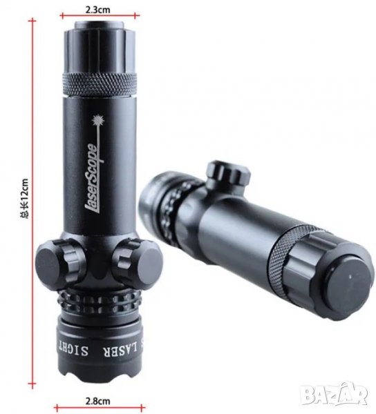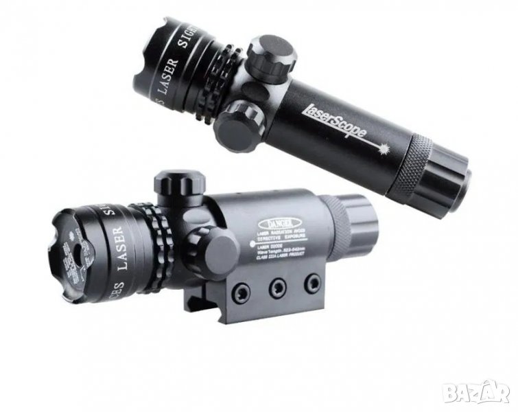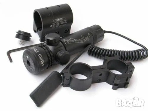 Лазерен мерник с всичко необходимо за прикрепване към оръжие, мерника е подходящ за поставяне най вече върху огнестрелна пушка.