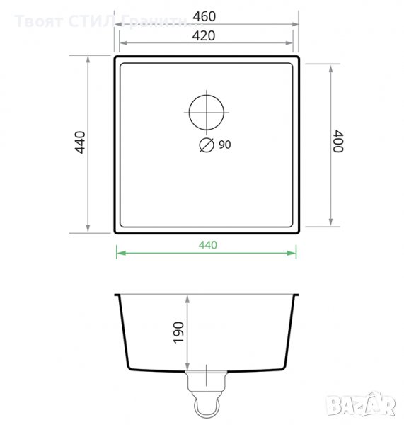 Снимките на продукта показват предлагания монтаж със сифони от Granitnimivki.BG . Показаните на графиките преливник и цедка не са част от мивката и се продават отделно.