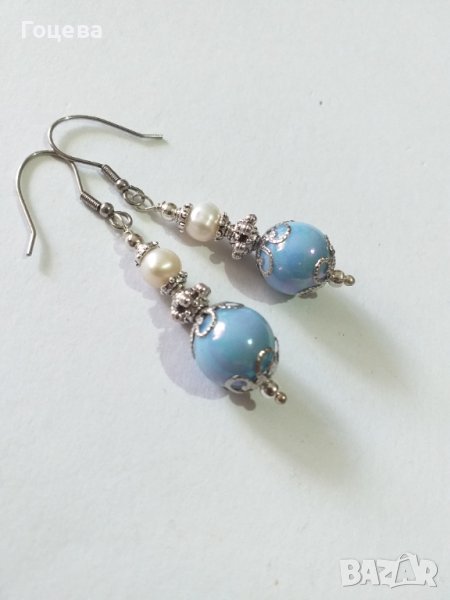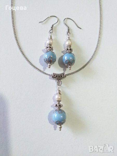 Красив комплект бижута с истински бели Тихоокеански перли и перлени сини мъниста → Обява 38233754