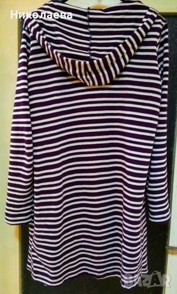 Лека жилетка с дължина до над коляното (88 см от основата на качулката); в бяло,лилаво и черно,на хоризонтално райе. С качулка,без закопчаване,с два джоба отпред,еластична.